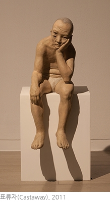 1전시실 입구에 웅크리고 있는 소녀, '버터플라이'의 비쩍 마른 등에는 기다랗고 처참하게 갈라진 틈이 눈으로 만져진다. 마치 변태(變態)한 나비의 빈 껍질과도 같이 공허하고 쾡한 모습은 누군가에게 생명질을 모두 빨려버린 듯한 형국이다. 타율에 의한 꿈의 상실, 혹은 스스로의 과도한 욕구충동에 포획되어 꿈을 팔아버리고 결국 좀비처럼 되어버린 미래의 인간흔적이기도 하다. 전시공간 중앙의 푸른색 비옷을 걸친, '피를 쥐고 있는 소녀'는 보이지 않는 두터운 벽에 갇힌 듯 애절한 표정을 간직하고 있다. 꽉 쥔 주먹에서 흘러나오는 선혈은 깊은 상처와 복수의 감정을 동시에 상징하고 있다. 다른 인물상과는 달리 발가벗겨진 모습이 아닌 이 소녀에게 있어 우비는, 비록 그것이 불완전하기는 하지만, 유일한 방어기제이자, 보호막일 것이다. 상실한 것이 무엇인지는 모르겠으나, 다른 인물들과 마찬가지로 욕망이 충족되지도 행복하지도 않은, 궁금증과 불안함을 더욱 증폭시키는 모습이다.