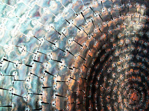 이번에 발표되는 박충흠의 작품들은 일정한 크기와 형태로 잘라낸 동판을 산소용접으로 이어 붙여서 만든 금속작업들이다. 작은 네모꼴, 세모꼴의 동판 조각들 수백 수천 개가 모여서 거대한 그릇 모양이 되기도 하고 완만한 곡면을 담고 있는 부조 모양이 되기도 한다. 우선 그것이 집요한 반복노동을 요하는 작업이라는 점이 눈을 끈다. 바깥세상의 리듬으로부터 벗어나 수공업적 노동에 열중하고 있는 그의 모습은 거의 종교적인 구도자의 모습을 연상케 한다. 용접작업을 해본 사람만이 아는 매혹 속에 그는 모든 것을 잊고 몰입한다. 적절하게 조절된 용접기 불꽃에 의해 단단한 쇠붙이가 발갛게 달아오르고 녹아 붙는 과정과 그것이 다시 차갑게 식은 뒤에 접착부분에 남겨지는 작업의 생생한 흔적들은 사람을 무아지경으로 이끄는 매력이 있다. 그것은 점토를 한 점 한 점 붙여서 형태를 이루는 소조의 매력과도 일맥상통하는 것이지만, 주조라는 중간단계를 거치지 않고 매순간마다 곧바로 완결에 이르는 점에서 더 직접적이다.
