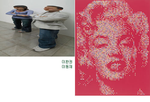 이환권과 권오상은 깍아내거나 살을 붙이는 전통적 조소의 방식 위에 새로운 기법과 감성을 더한 작가들이다. 이환권은 마치 삼차원 포토샵이라도 이용한 듯이 인체를 길게 늘리거나 납작하게 줄이는 등 비례와 원근법을 왜곡하여 공간감을 교란시키고, 권오상은 스티로폼 조각 위에 수천장의 사진을 붙여 만든 '사진조각'을 통해 2차원 매체가 3차원 매체로 변환되는 과정에서 발생하는 디테일의 변화와 실재성의 상실을 부각시킨다. 이동재 역시 이렇게 새로운 재료를 통해 매체의 가능성을 확장한다. 쌀알을 디지털 이미지의 최소 단위인 픽셀처럼 다루어 현대사의 걸출한 인물들의 초상을 점점이 그림으로써 '오브제와 도상의 관계를 유기적으로 확장(작가노트)'한다.