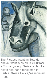 The works, Tête de cheval (Head of horse), created by Picasso in 1962 and Verre et pichet (Glass and pitcher), painted in 1944, were stolen from an exhibition in the small town of Pfaeffikon, near Zurich, in February 2008.
