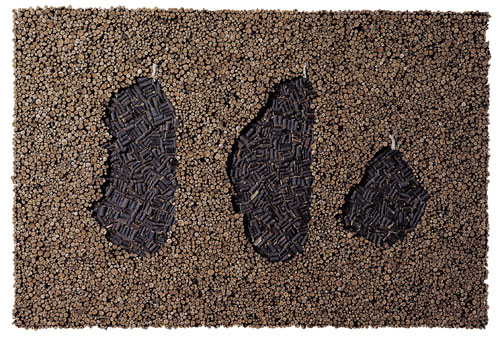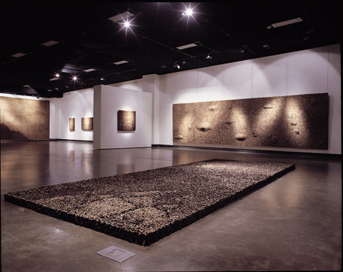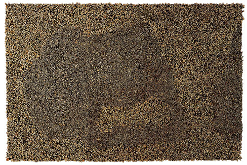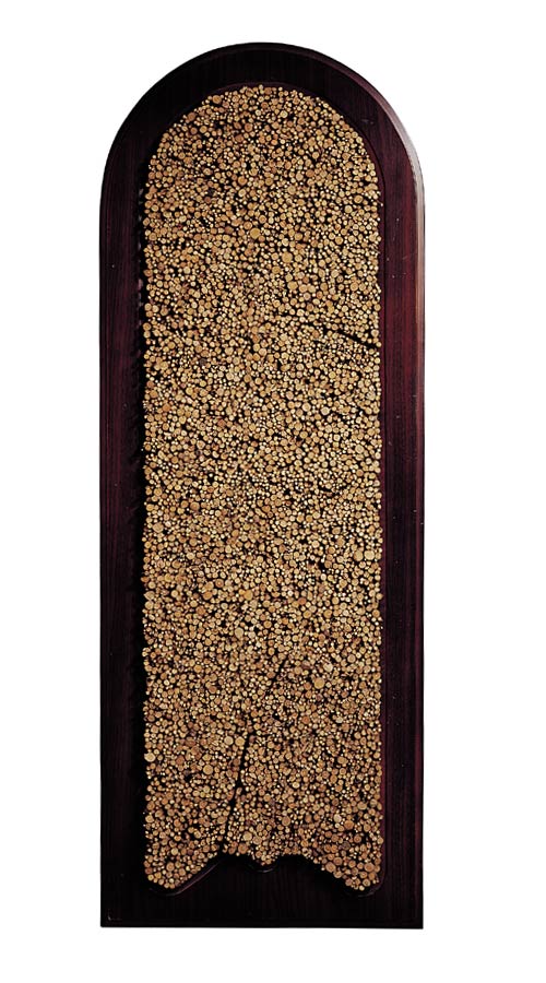일정한 평면의 피부 위에 자잘한 나무토막들이 직립으로 꽂혀있다. 나무 몸통의 단면, 잘려져 평면화 된 부분만이 우리 눈에 들어온다. 그것은 둥근 원형이자 평면이다. 화면을 철저히 땅/지표로 여기고 그 위에서 실재하고 있다. 나무는 그렇게 기이한 대지에 뿌리 박고 서있다. 흡사 모심기를 하듯이 그렇게 나무들을 일일이 심어 넣은 것도 같다. 언뜻 보아서는 잘 가늠이 가지 않지만 가까이서 들여다보면 그것들은 다름 아닌 생생한 나무들이다. 치밀하게 채워진 이 나무 조각들은 일종의 공간 공포를 보여주기도 한다. 이쑤시개나 성냥개비, 밴드나 약봉지 같은 것들을 화면 가득 메꿔 나간 작업들은 보았지만 작은 싸리나무를 3cm정도로 잘라서 건조시킨 후 포르말린 처리를 해서 패널 위에 일일이 손으로 붙여나가는 이런 지독한, 엄청난 작업은 낯설다. 우선 수공의 혹독하고 집요한 노동의 시간, 수행의 차원에서 행해지는 작업, 평면과 입체 사이의 경계에서 진행되는 회화적이면서도 부조적인 작업, 철저하게 물질만으로 물질의 실존과 물질체험을 통한 또 다른 연상과 감상의 자리를 확보해주는 등의 여러 의미를 지닌 작품으로 다가온다.